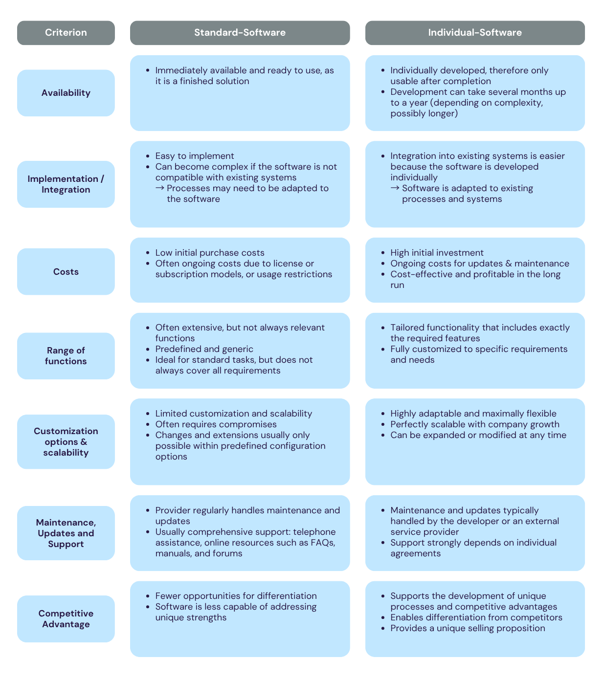 Standard software offers fewer opportunities for differentiation in this regard, as it is more geared toward general requirements and therefore does not offer any unique selling points or is less able to respond to individual strengths.